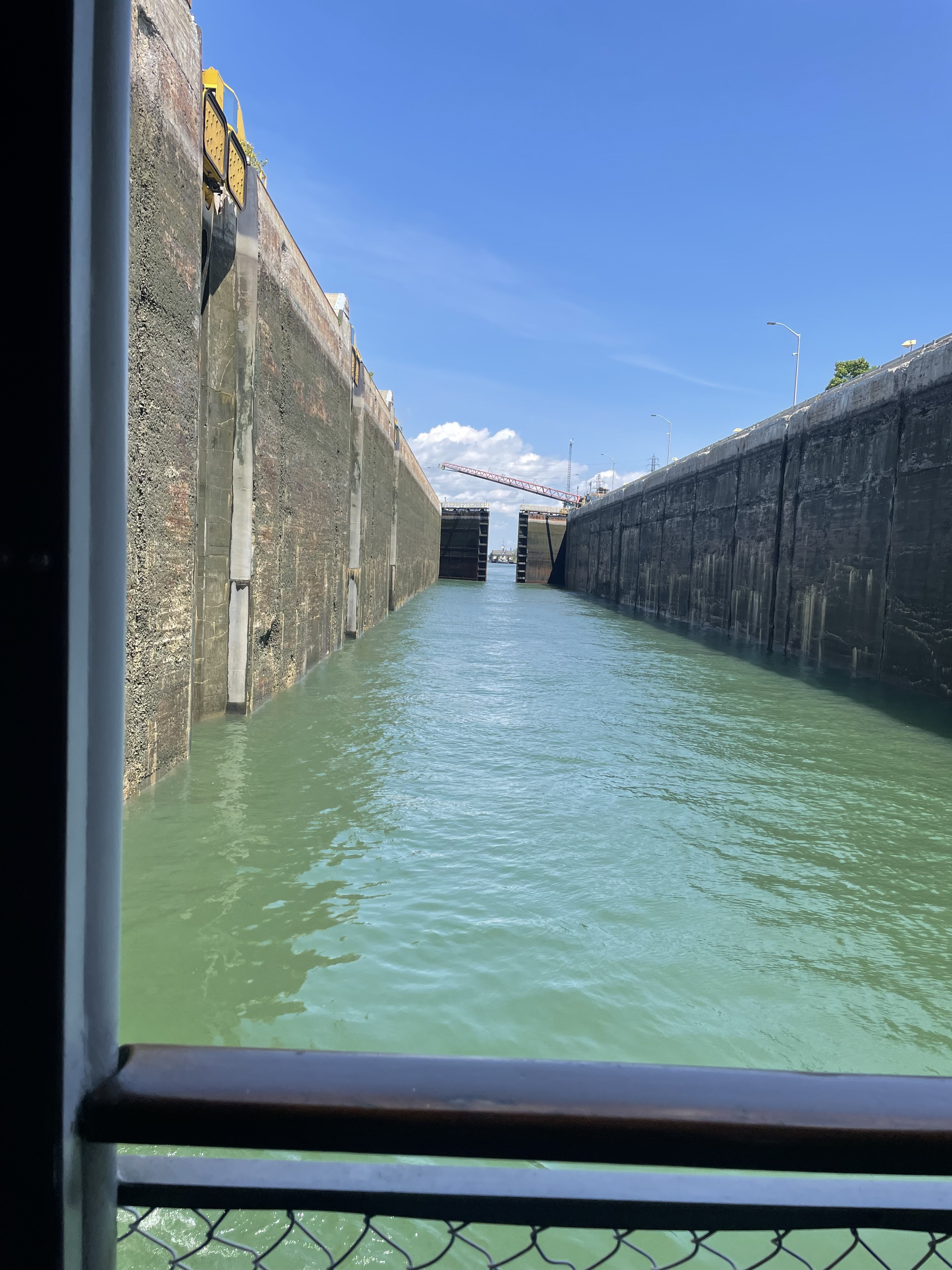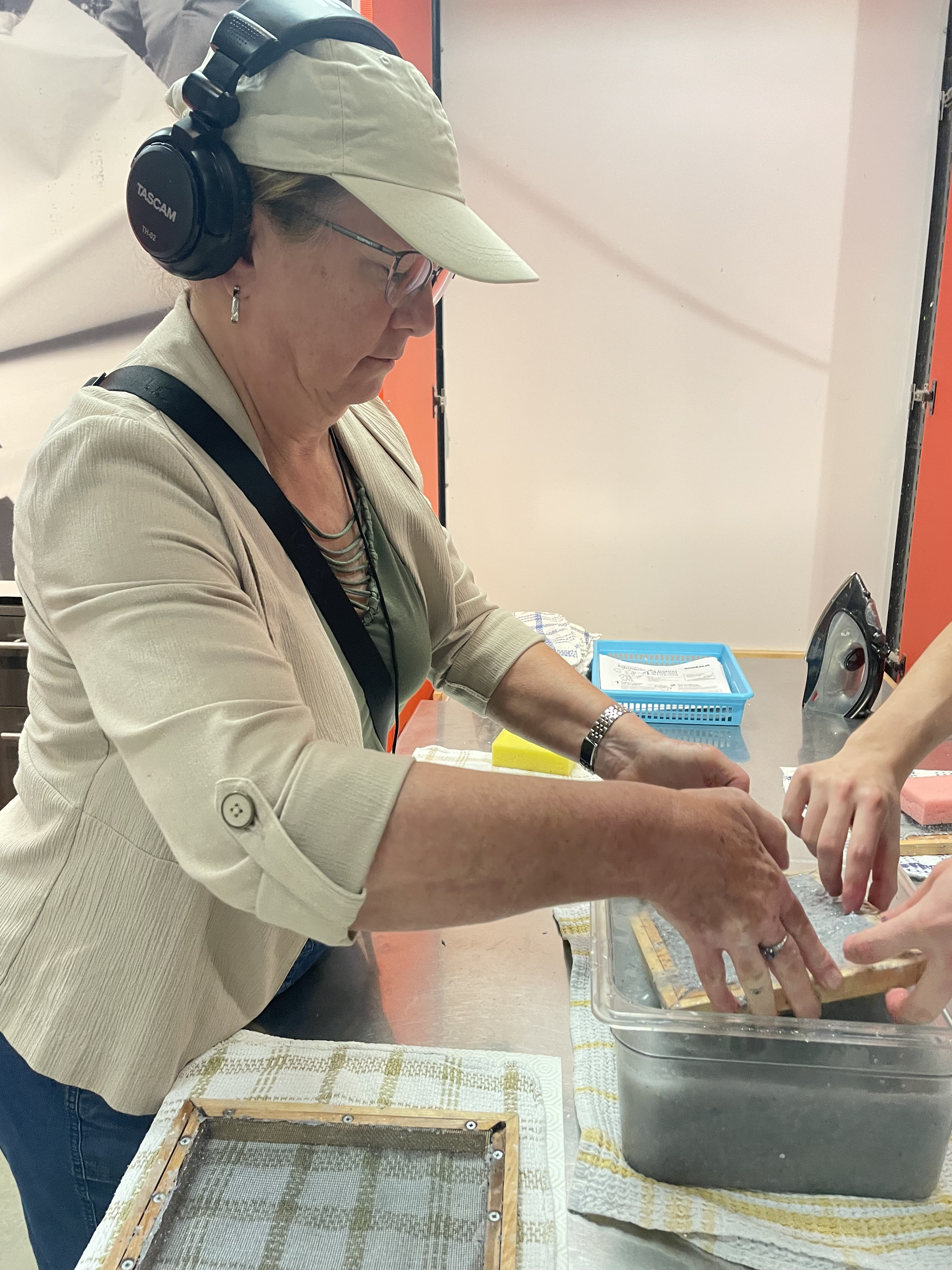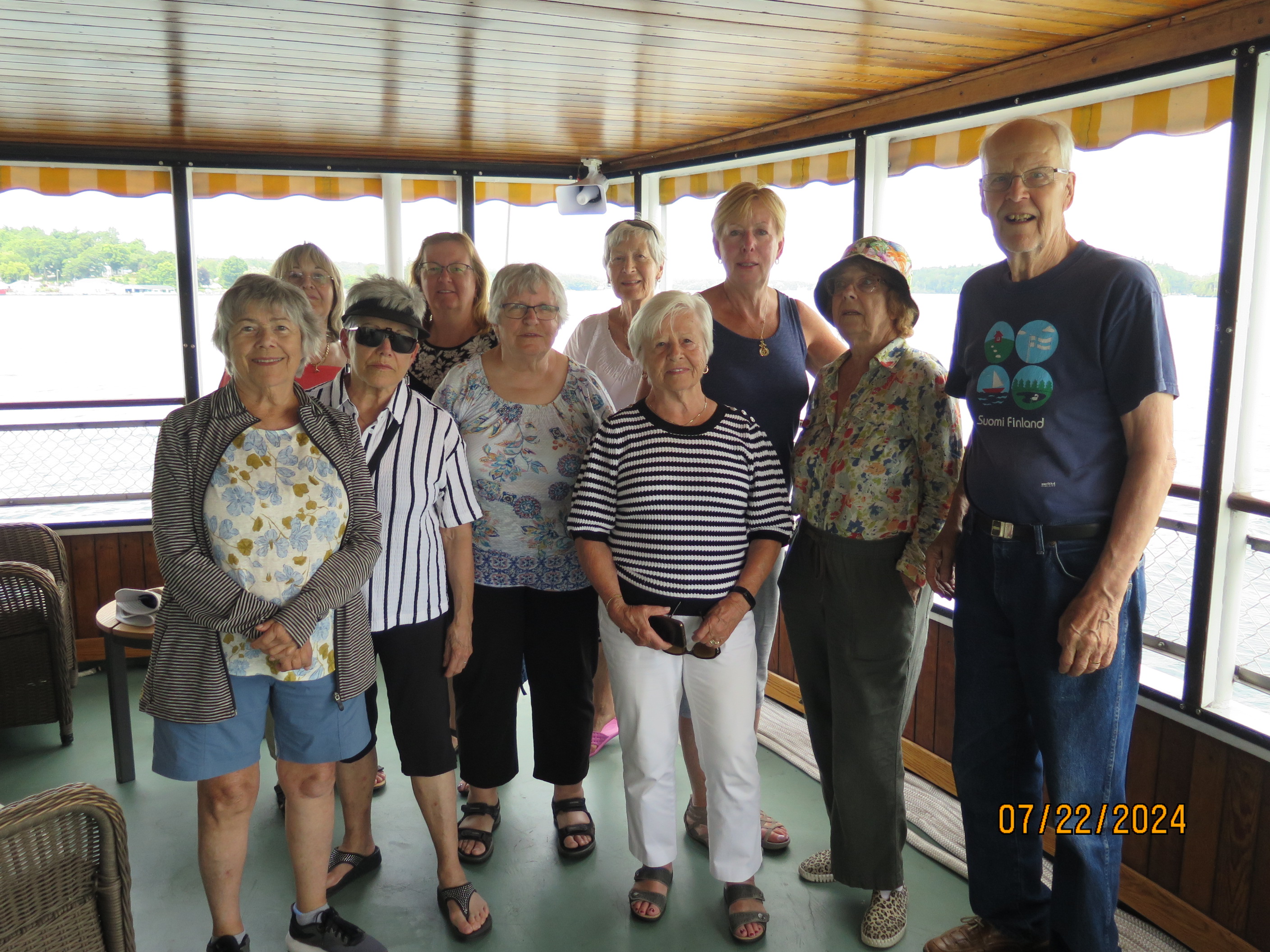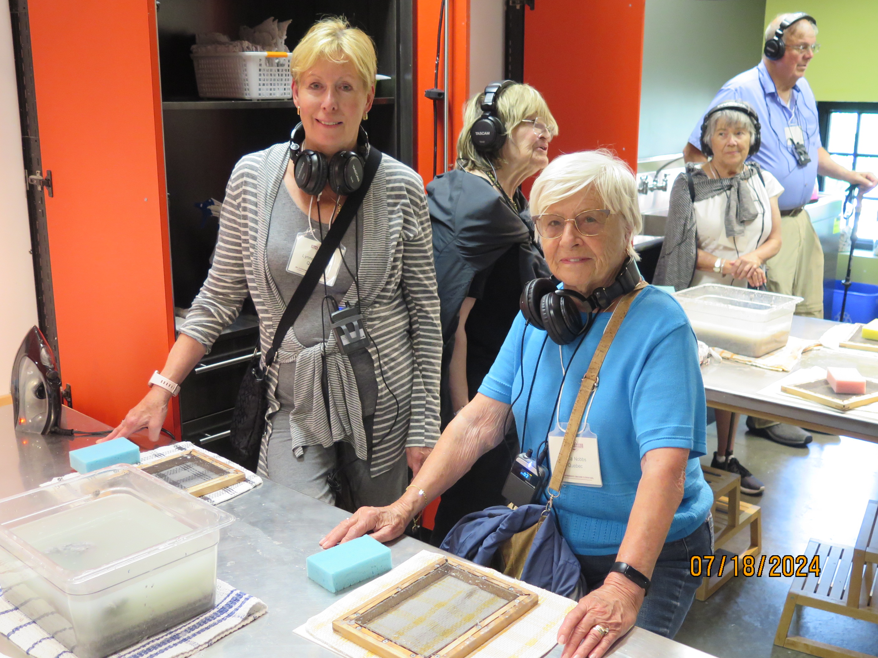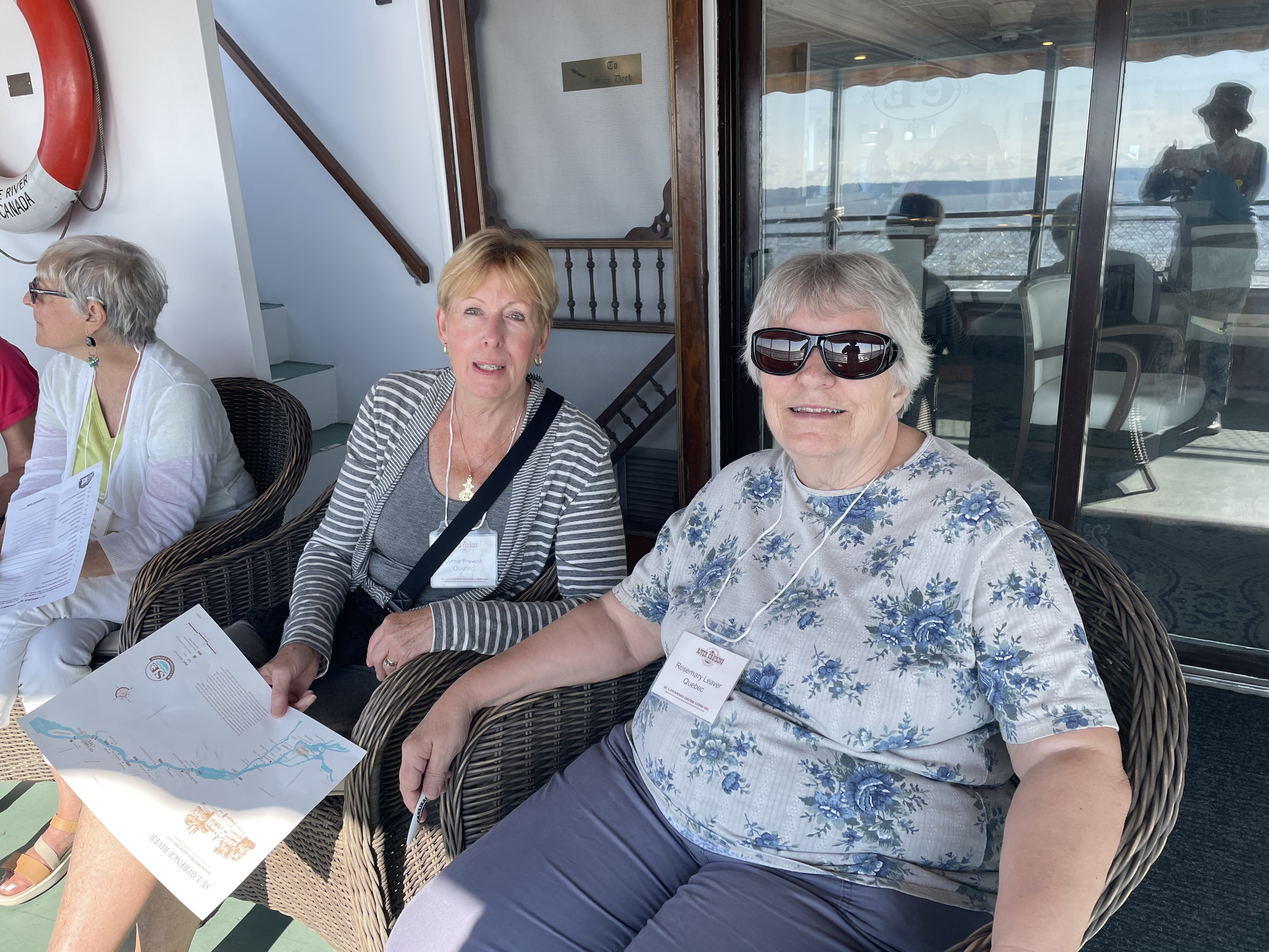 President Lynne Prevost and Vice-President Rosemary Leaver on deck. Sur le pont. One of the seven locks we passed through. L'une des sept écluses que nous avons traversées. Sandra Gauthier makes a sheet of paper at the Boreal Museum in Trois-Rivières, and Lynne and Erika Nobbs do the same. Elles font une feuille de papier dans la Musée Boréal. All 10 travellers from our club are seen on the boat in a group photo. Nos voyageurs sont vu dans une groupe. De gauche à droite, Marguerite Lane, Linda Cutler, Hélene Lane, Sandra Gauthier, Rosemary Leaver, Erika Nobbs, Eeva-Liisa Makkonen, Lynne Prevost, Barbara Peden and Ismo Makkonen. The Makkonens did us proud on the dance floor. Bravo! Other excursions included Pointe-à-Callière history museum at Montreal's Old Port, the Moses-Saunders hydro-electric dam at Cornwall, and a pleasure-boat museum at Gananoque. There were 54 passengers on the boat, and 14 busy crew. We had good dinners and live entertainment every night. Il y avait 54 passagers sur le bateau et 14 membres d'équipage très occupés. Nous avons eu de bons dîners et des spectacles tous les soirs.